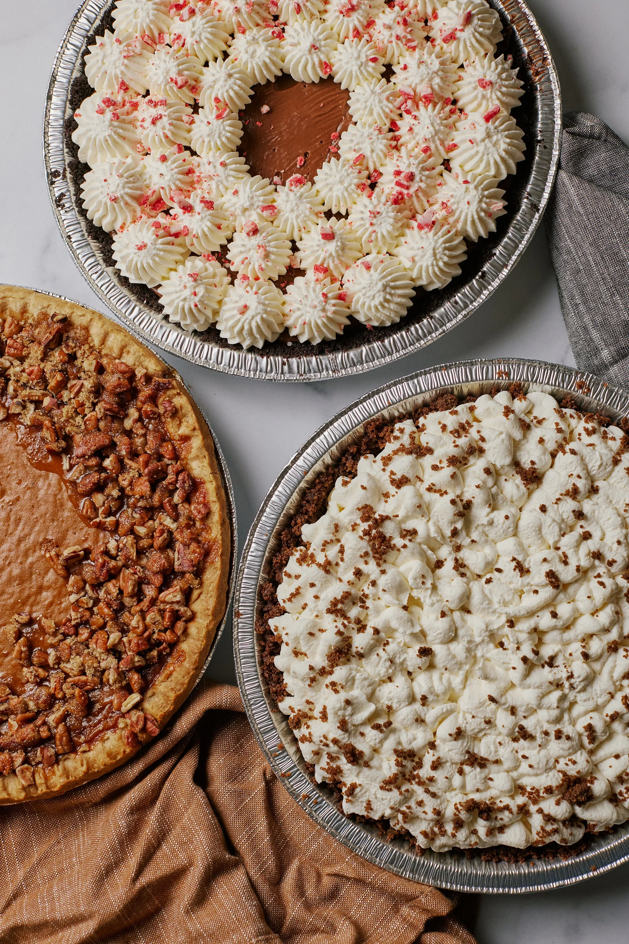 Petsi Pies' holiday tradition - luscious chocolate custard filling in a chocolate cookie crust and topped with peppermint flavored whipped cream.