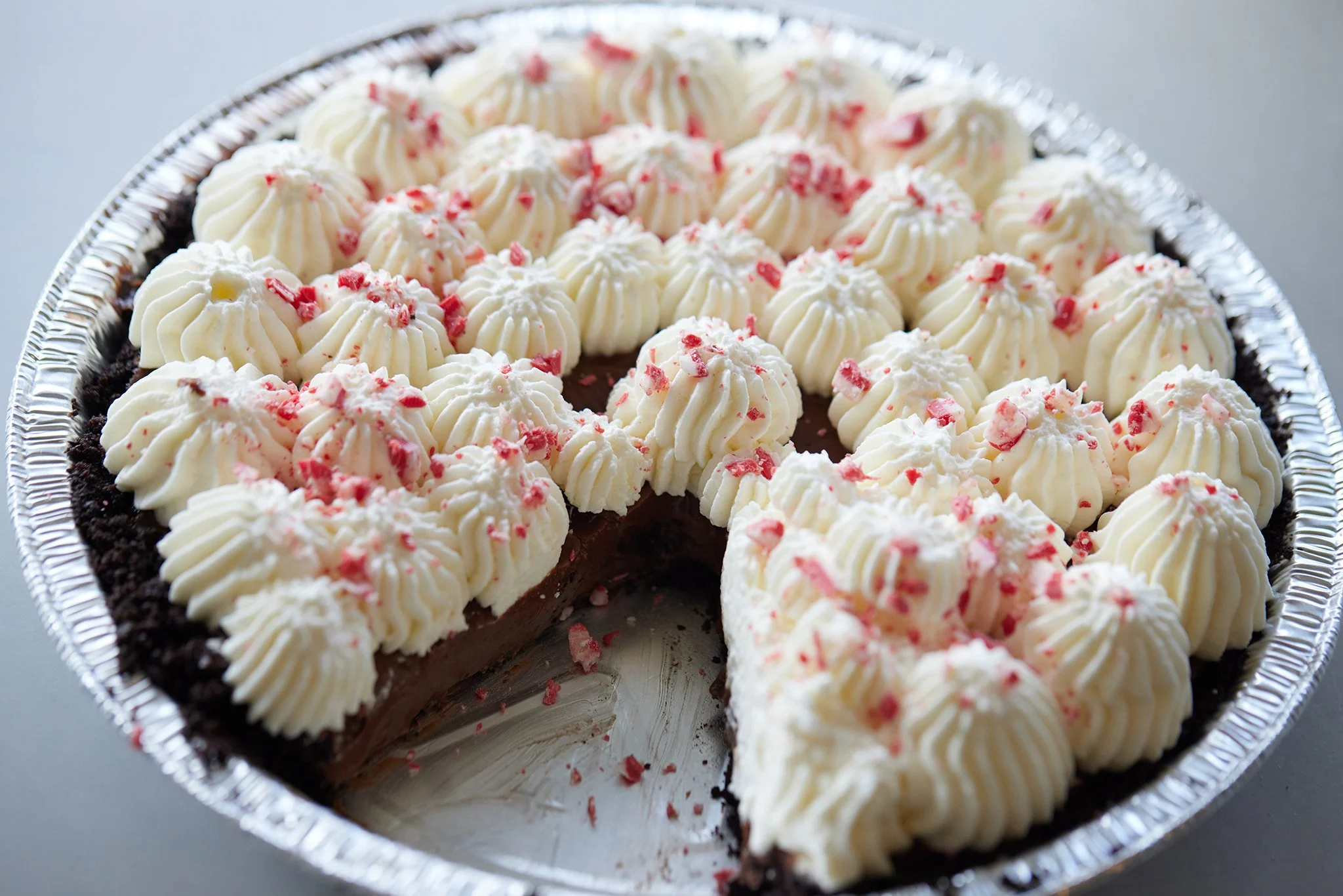 Petsi Pies' holiday tradition - luscious chocolate custard filling in a chocolate cookie crust and topped with peppermint flavored whipped cream.